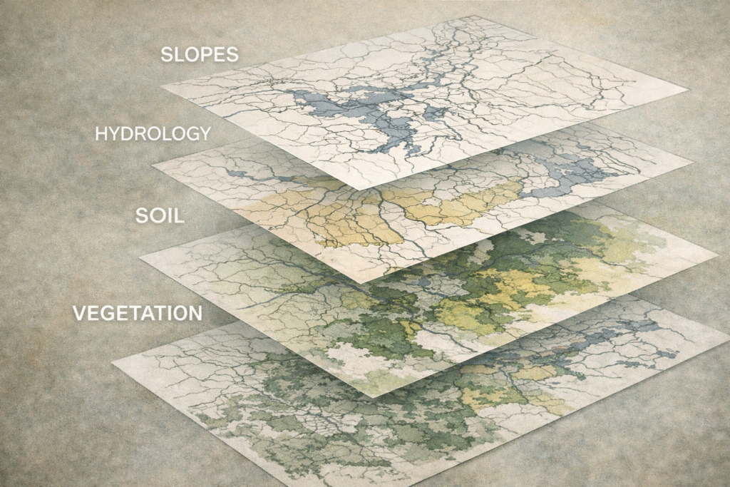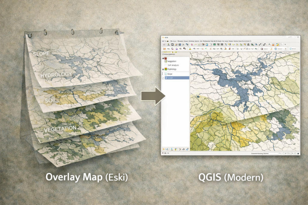 Uygun olan yerler kendini belli eder, riskli alanlar bağırarak uyarır. Bugün QGIS’te birkaç tıklamayla yaptığımız overlay analizinin felsefesi, işte bu masalarda doğmuştur.
